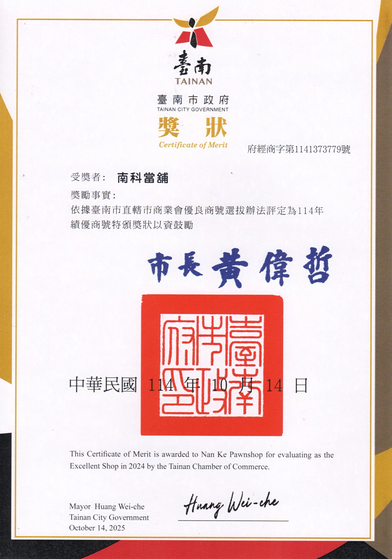 恭賀~!! 南科當鋪 榮獲114年台南市直轄市商業會 優良商號<績優商號>
